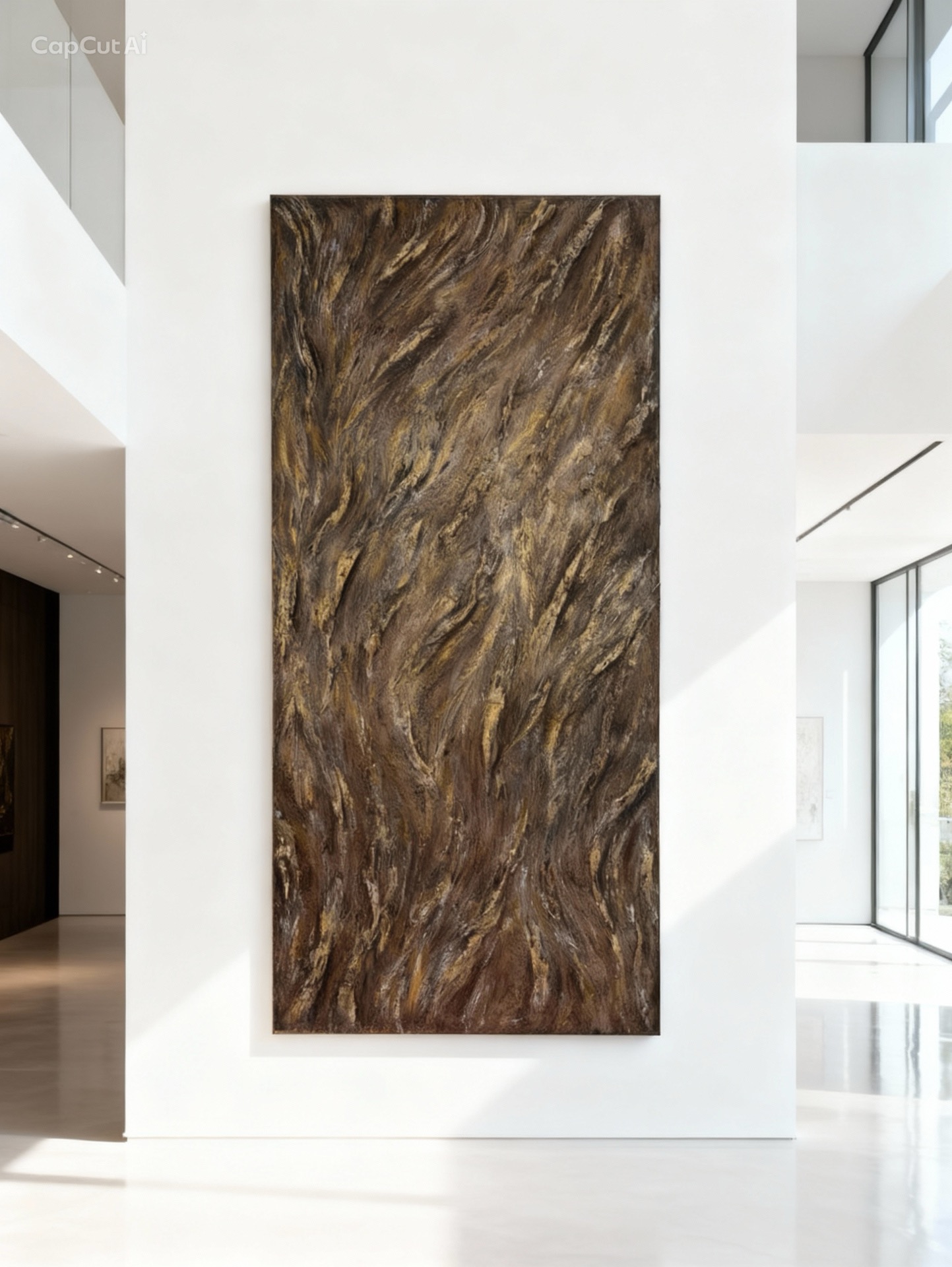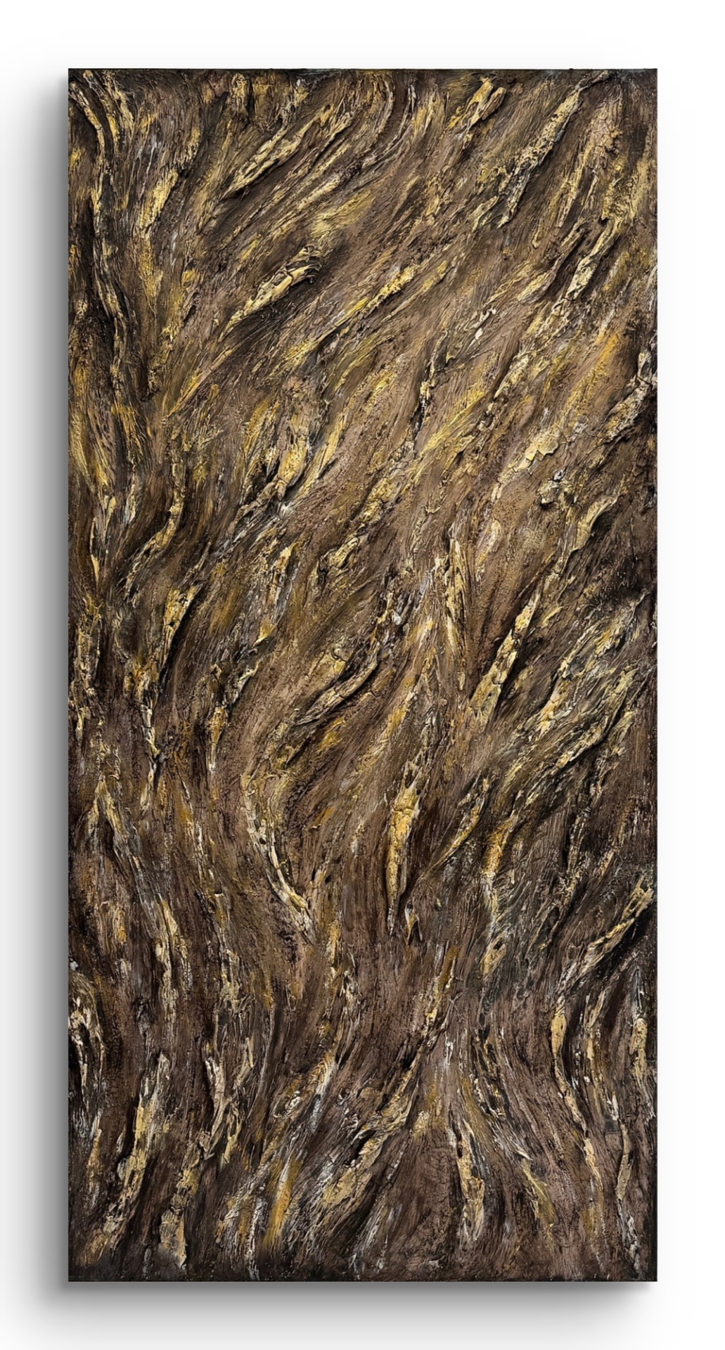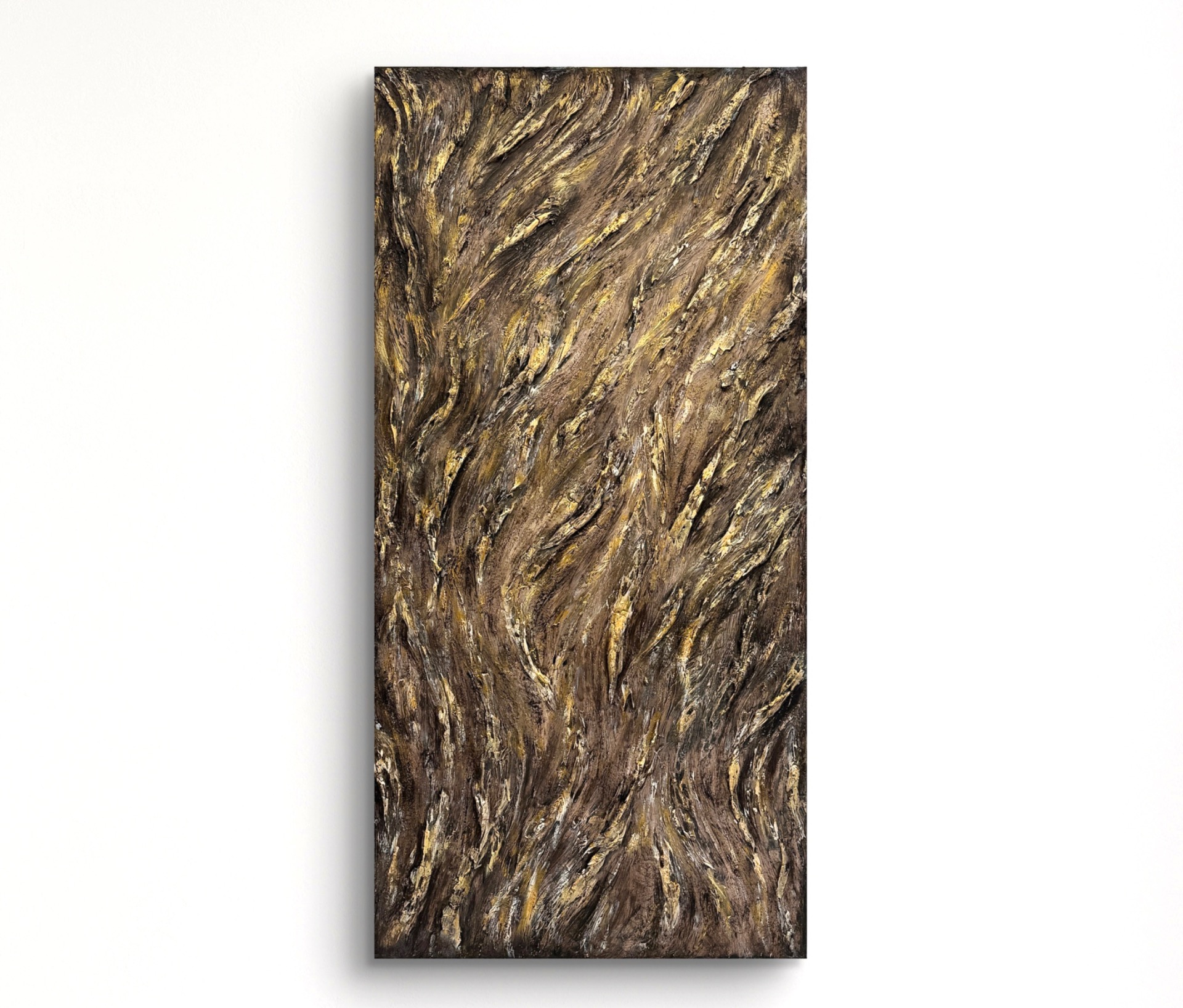 Obraz vytvorený so štrukturovacou pastou s vysokým reliefom v hnedozlatom odtieni. Obraz je ideálne nasvietiť z jednej strany, aby vynikla štruktúra.