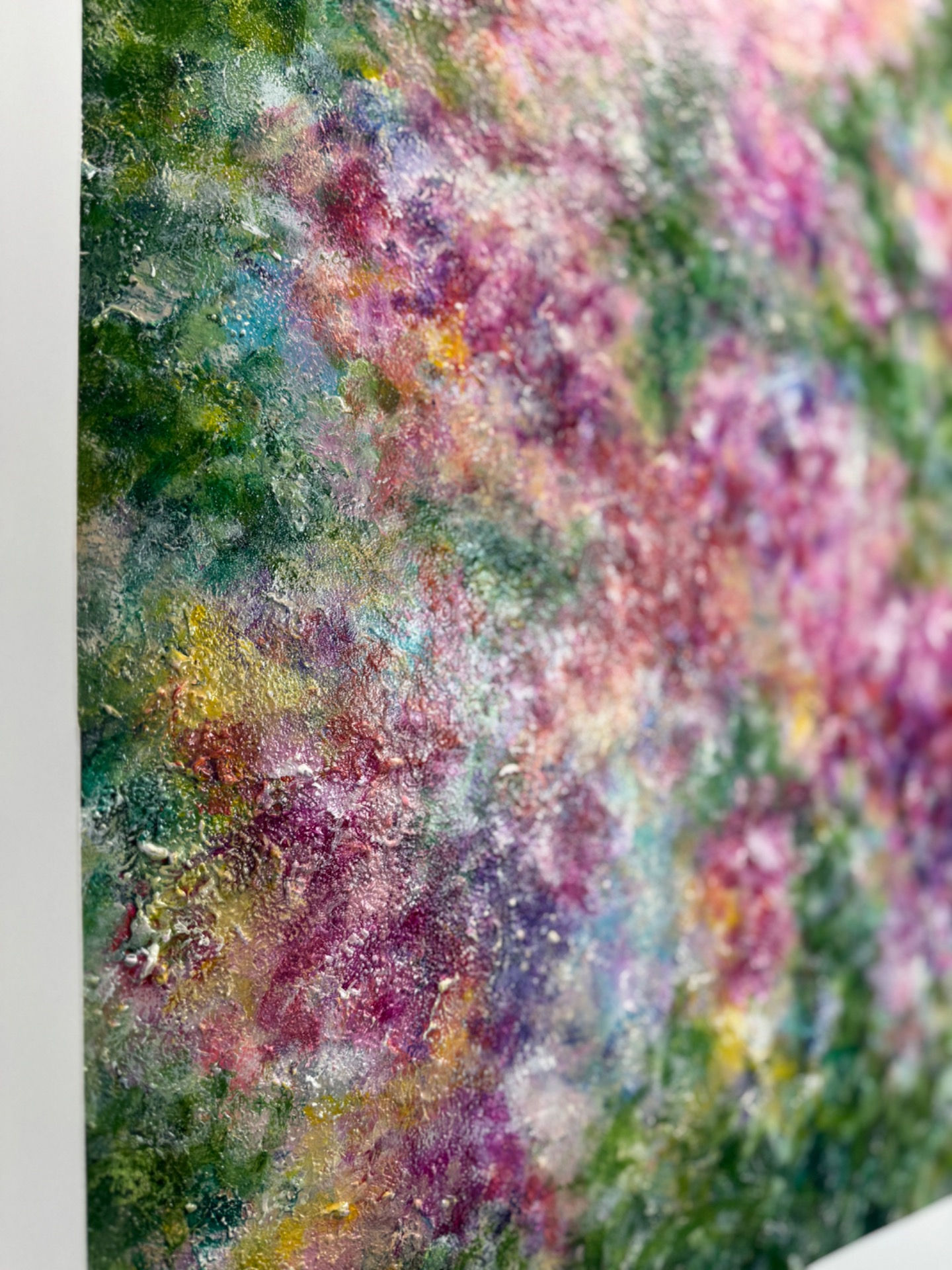 Motív rozkvitnutých kvietkov namaľovaný akrylovými farbami na preglejke.